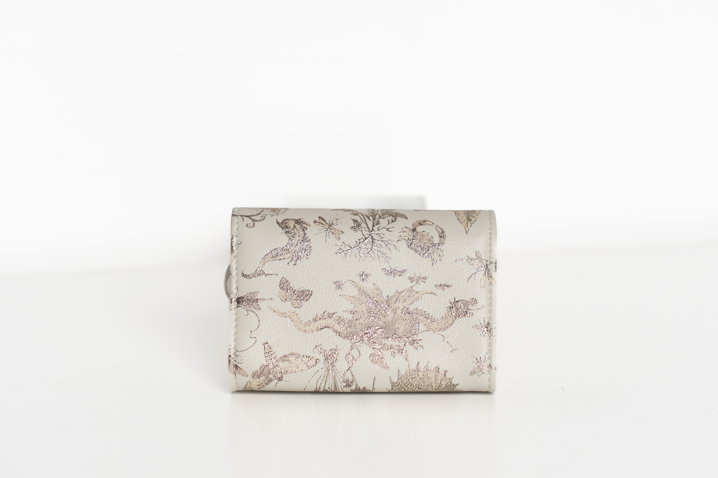 Stampa color oro con motivi floreali e logo CD avanti e chiusura a pattina.