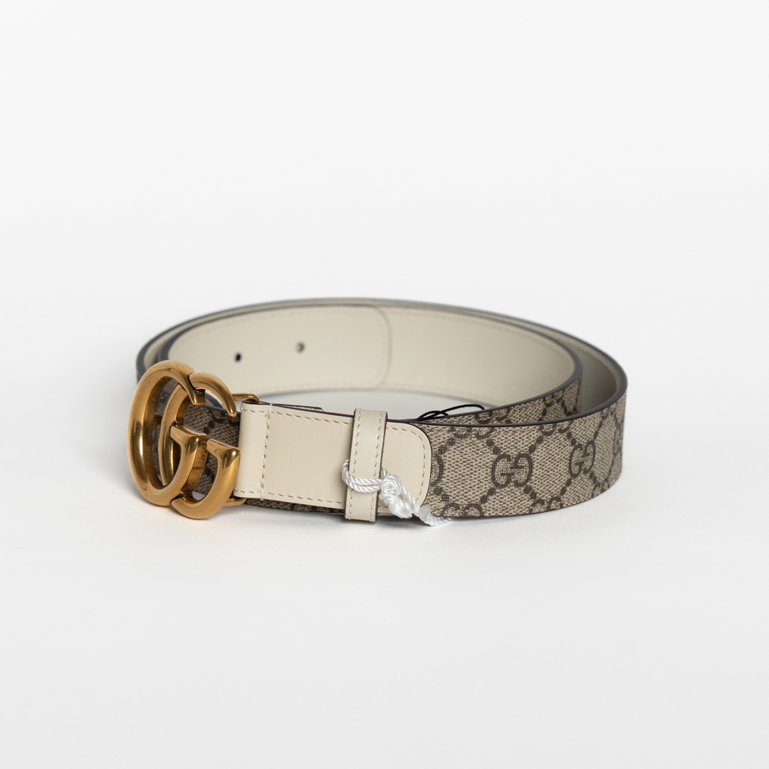 Cintura Gucci in tessuto GG Supreme e pelle di colore bianco.