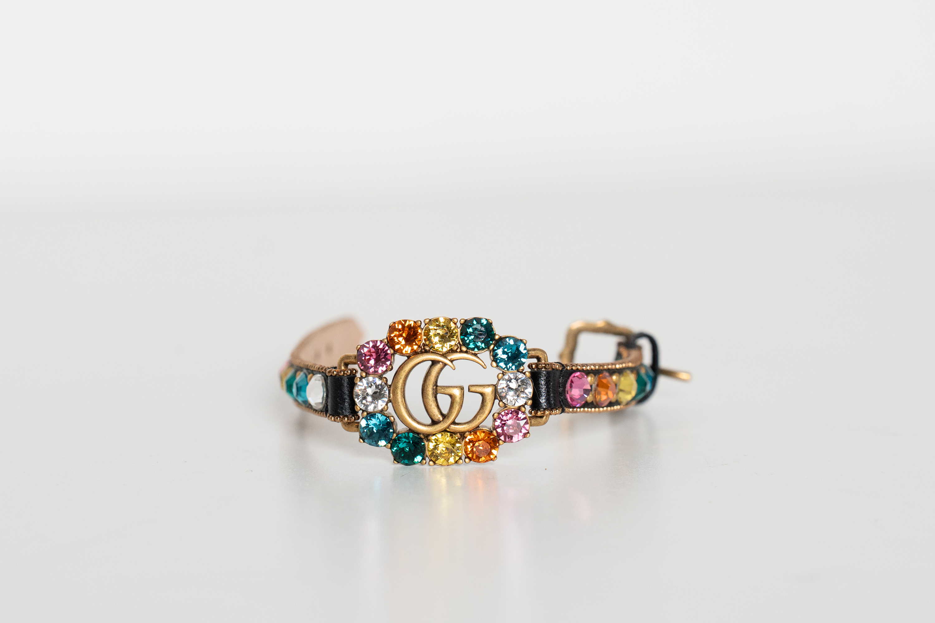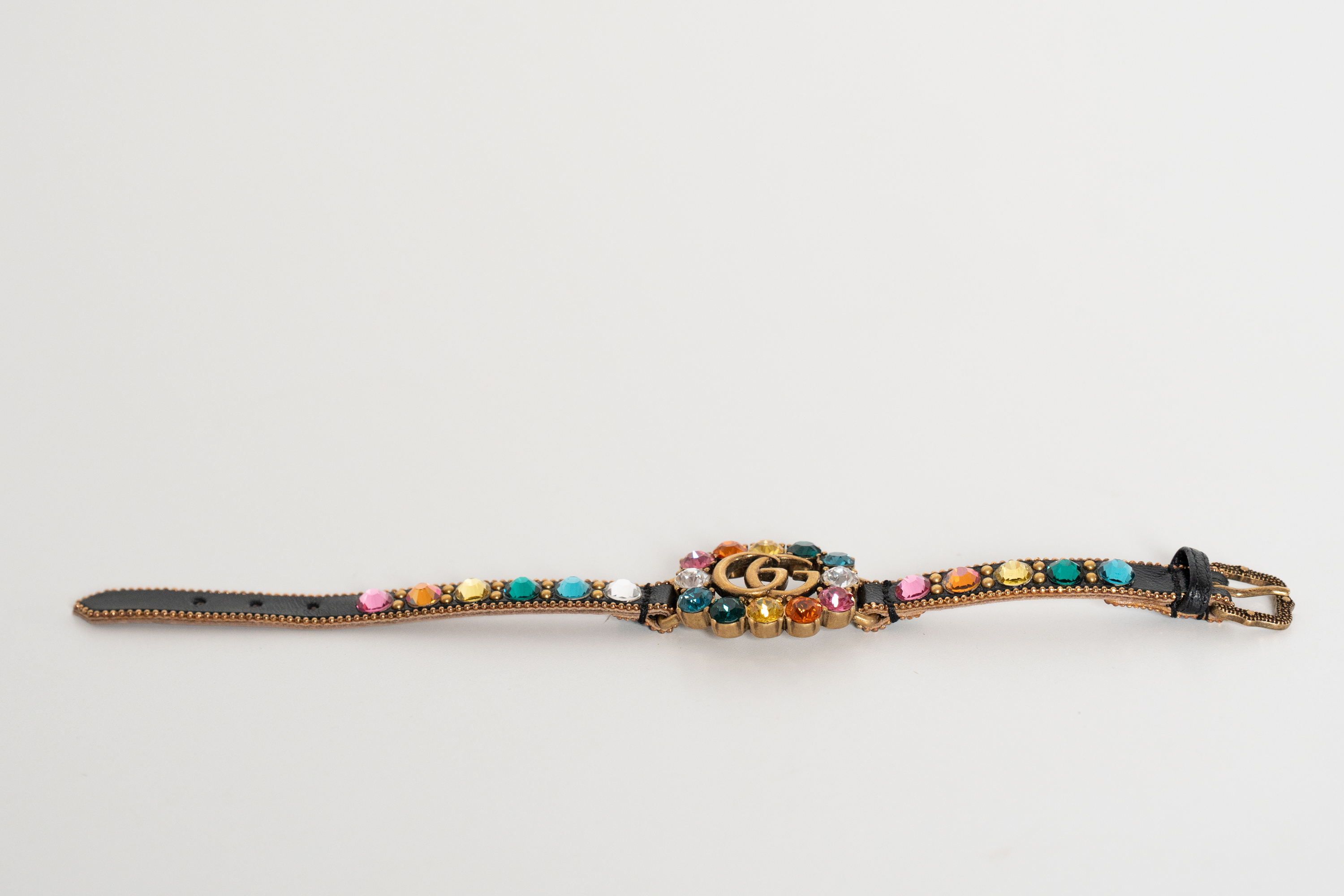 Bracciale Gucci Double GG in pelle con borchie di cristalli multicolor.