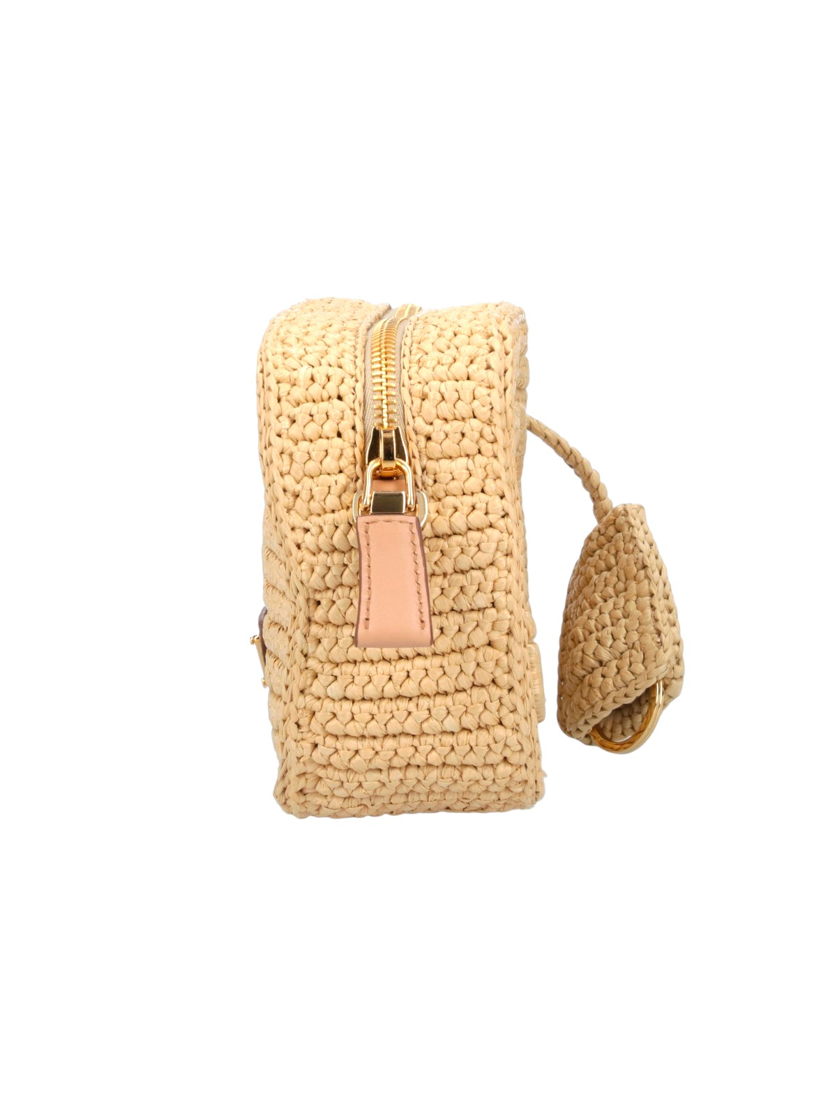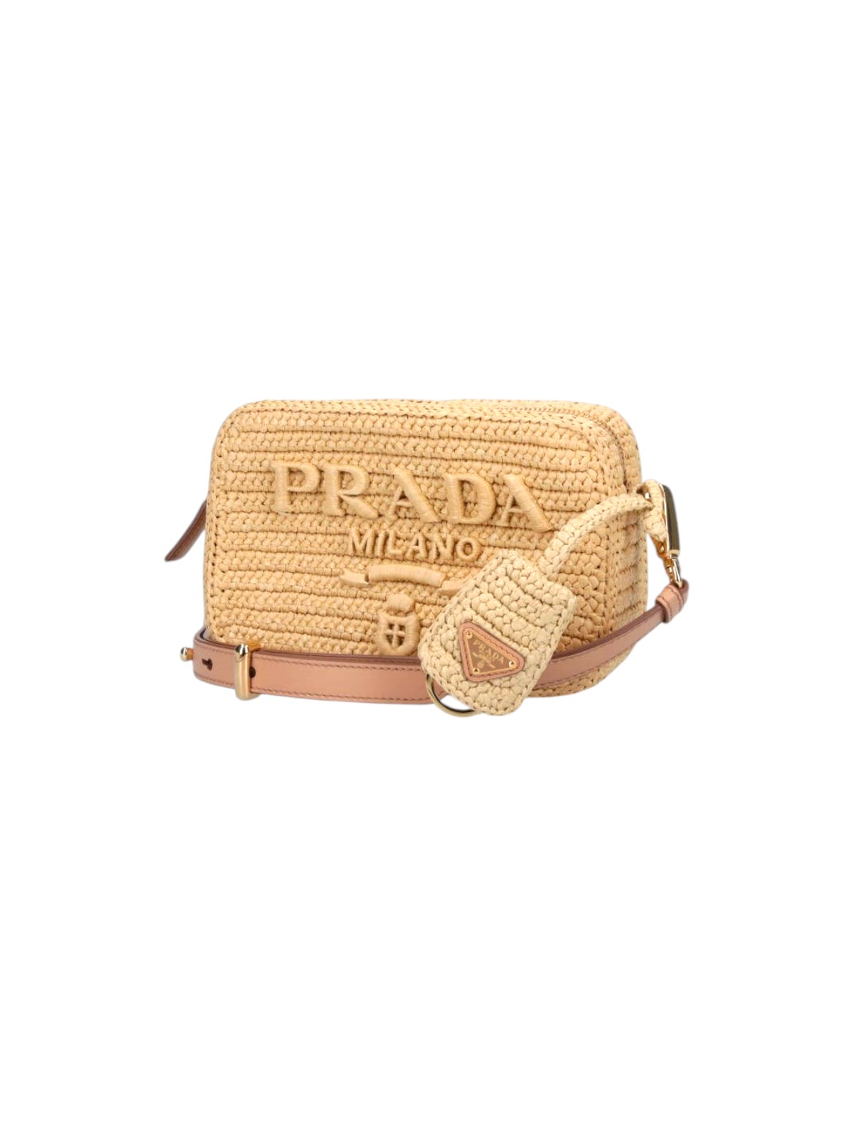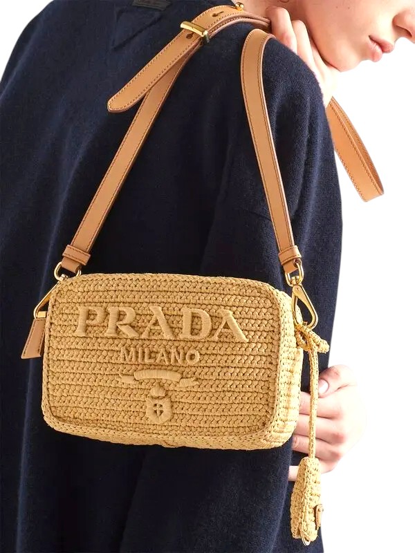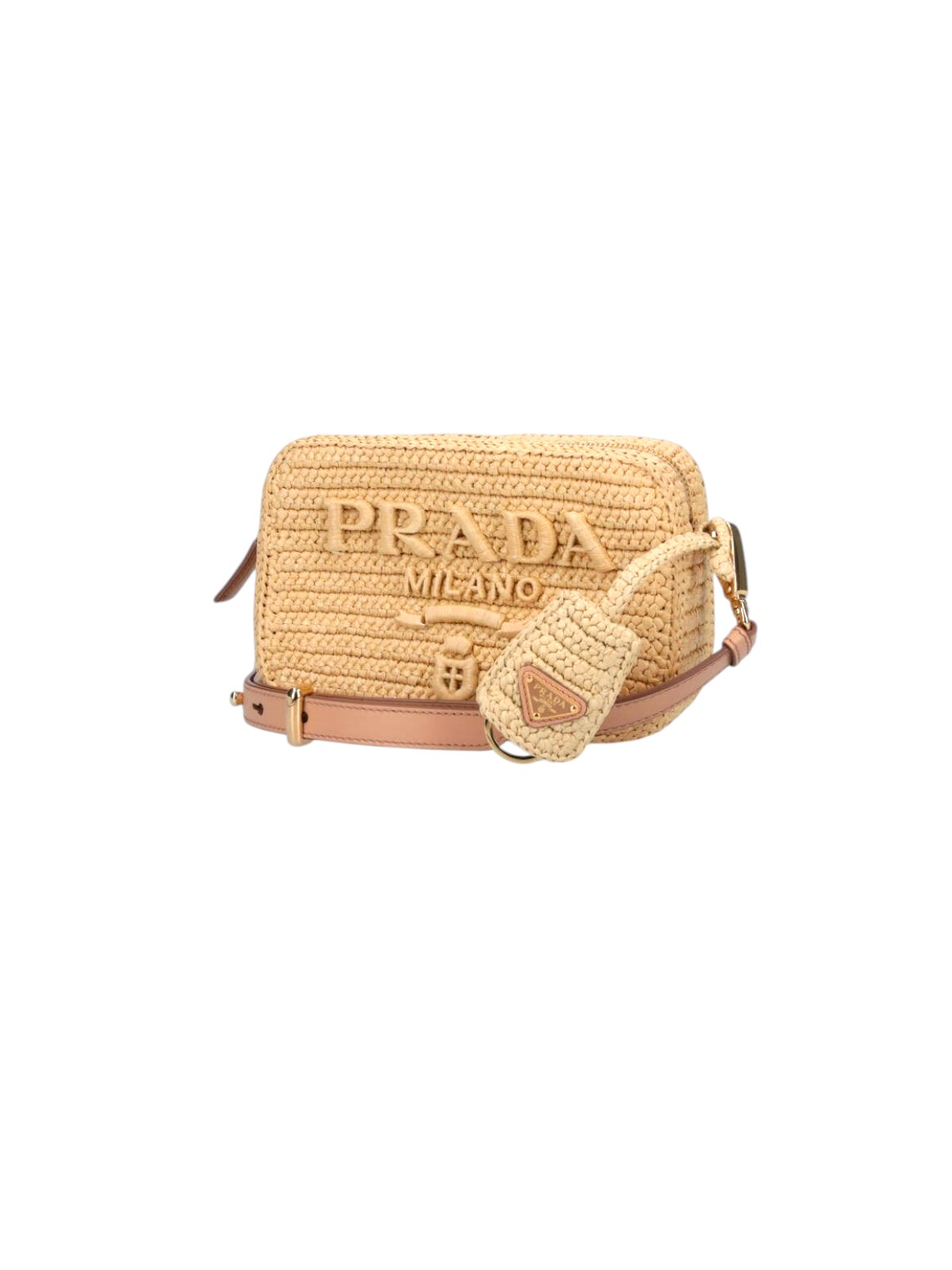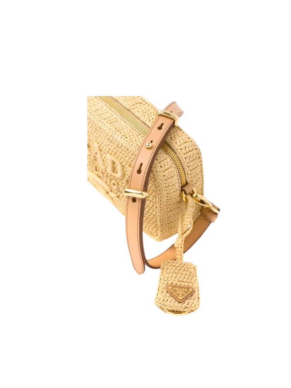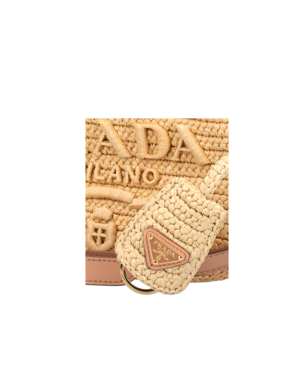 Borsa a spalla Prada in rafia beige con tracolla regolabile in pelle e removibile con logo.