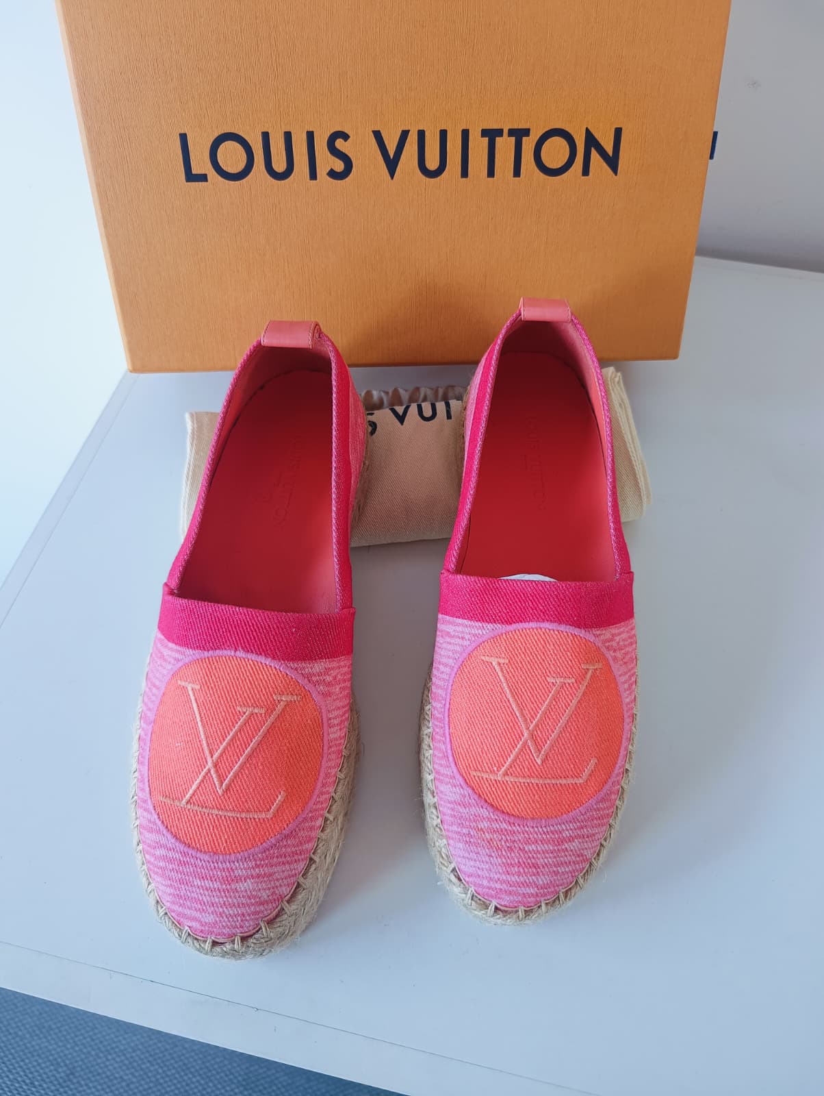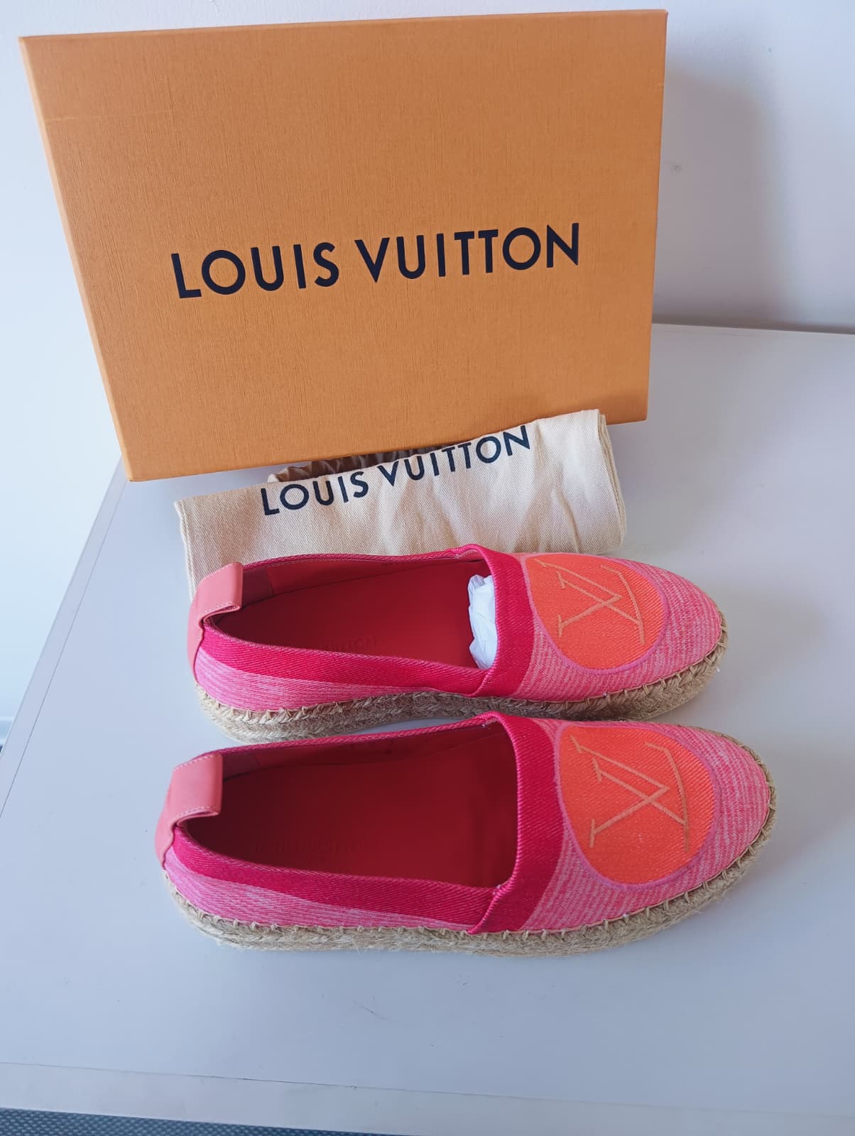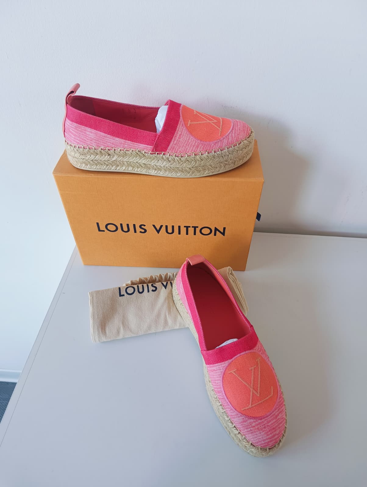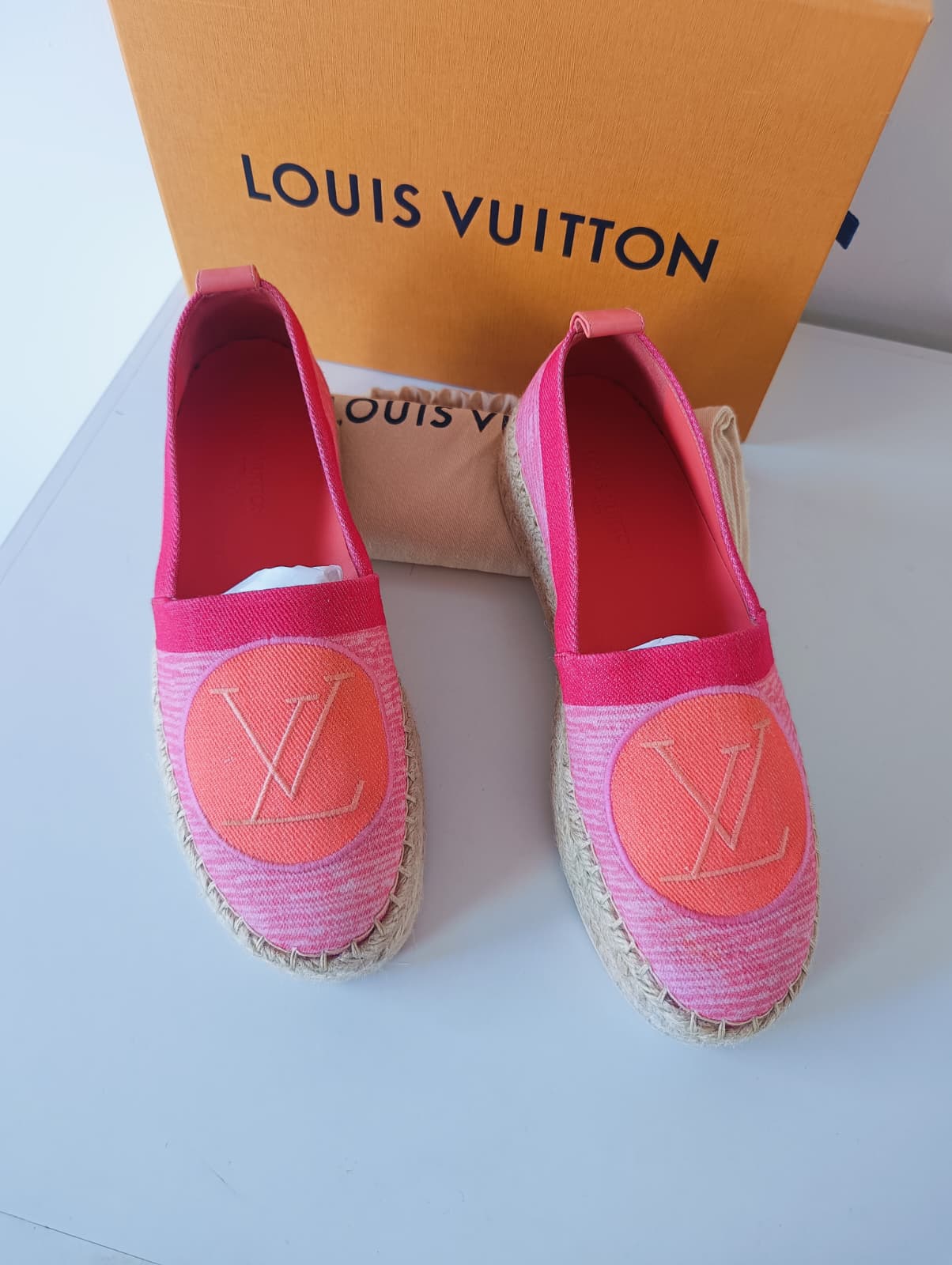 Queste espadrillas di Louis Vuitton sono realizzate in denim rosa e presentano dettagli in corda di iuta sulle piattaforme, punta chiusa e arrotondata, loghi LV ricamati sulla tomaia, linguette in pelle corallo sul retro, fodera in pelle e suole in gomma.